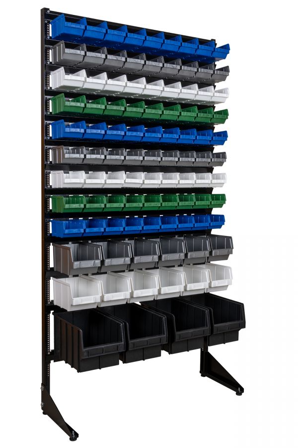 Универсальный металлический стеллаж - с пластиковыми лотками. Для систематизации и хранения мелких автозапчастей, электротоваров, метизов, крепежных изделий, сантехнических и других комплектующих.